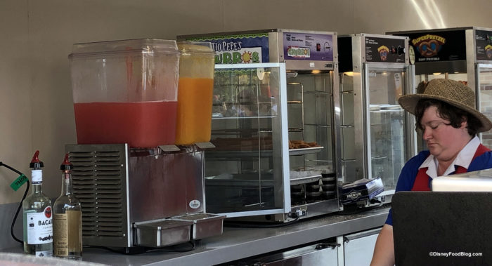 You’ll find spirited drinks, beers, soft drinks, water, non-alcoholic specialty drinks as well as Churros and Mickey Pretzels here.