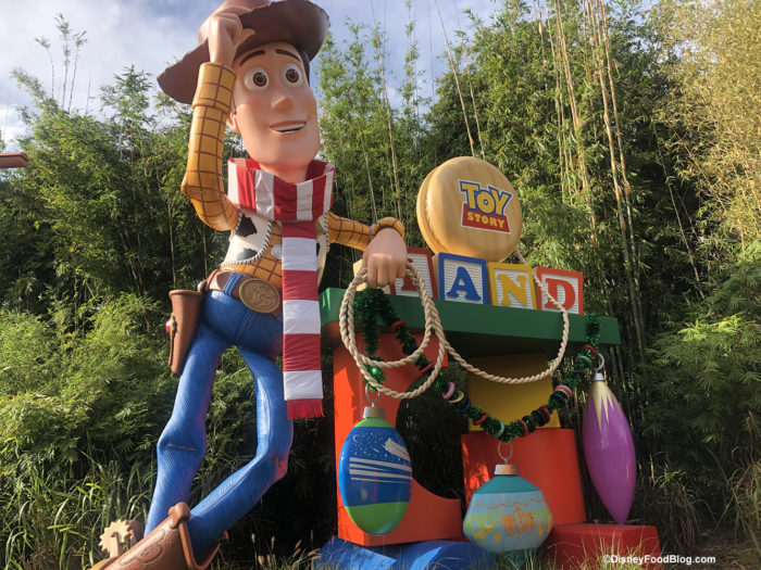 Even though the Christmas decorations will be taken down this week we spotted some additions to the decorations in the area since our visit right before Christmas. There are new (giant) ornaments on Woody’s Toy Story Land Sign as well as some new garland.