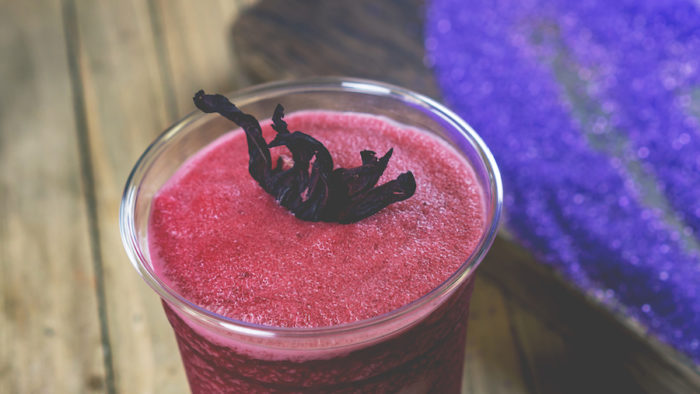 Jamaica Freeze with candied hibiscus flowers