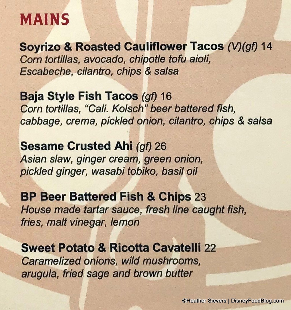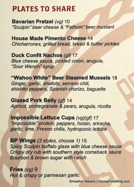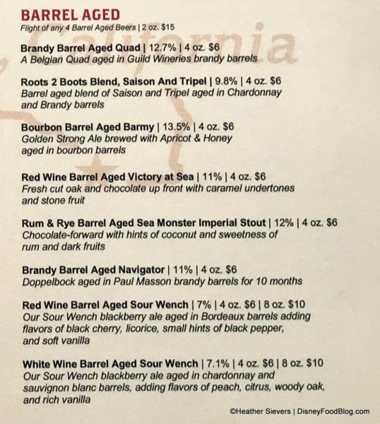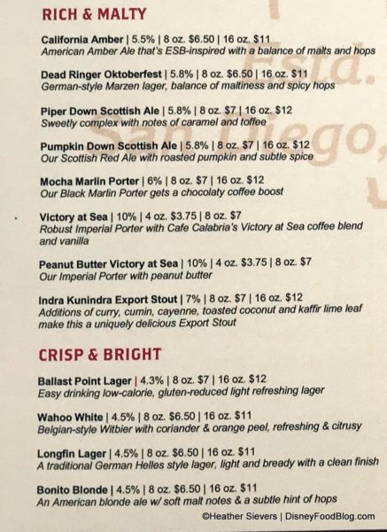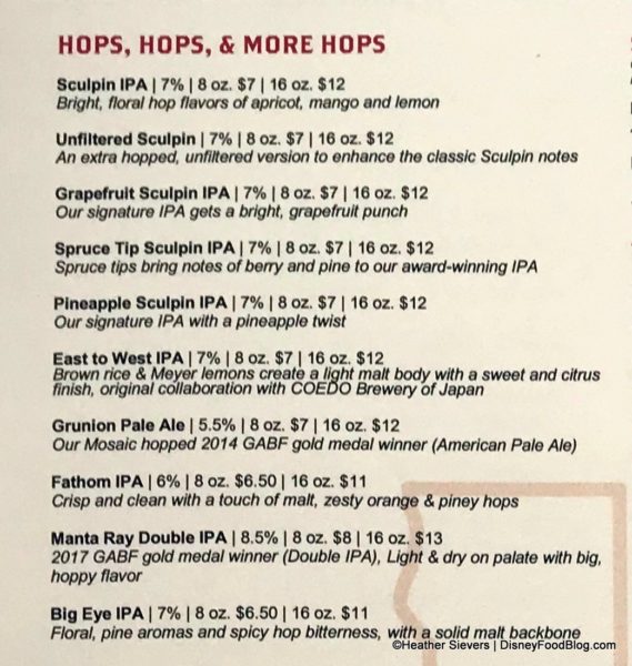 Guests can expect to find anywhere from 30 to 50 beers on tap at any time. These include limited edition brews exclusive to Downtown Disney. The menu is divided into sections starting with Hops, Hops, & More Hops; Rich & Malty; and Crisp & Bright. (Just click any of the menu images to enlarge for easier reading.)