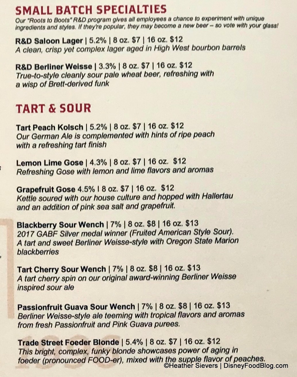Small Batch Specialties and Tart & Sour are up next. The Small Batch Specialties are part of the “Roots to Boots” Research & Development program, which gives employees the chance to experiment with the ingredients, as noted on the menu. If the brew is a hit, it may become a new beer on the menu, so “vote with your glass!”