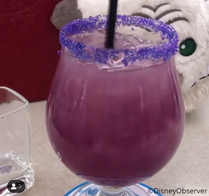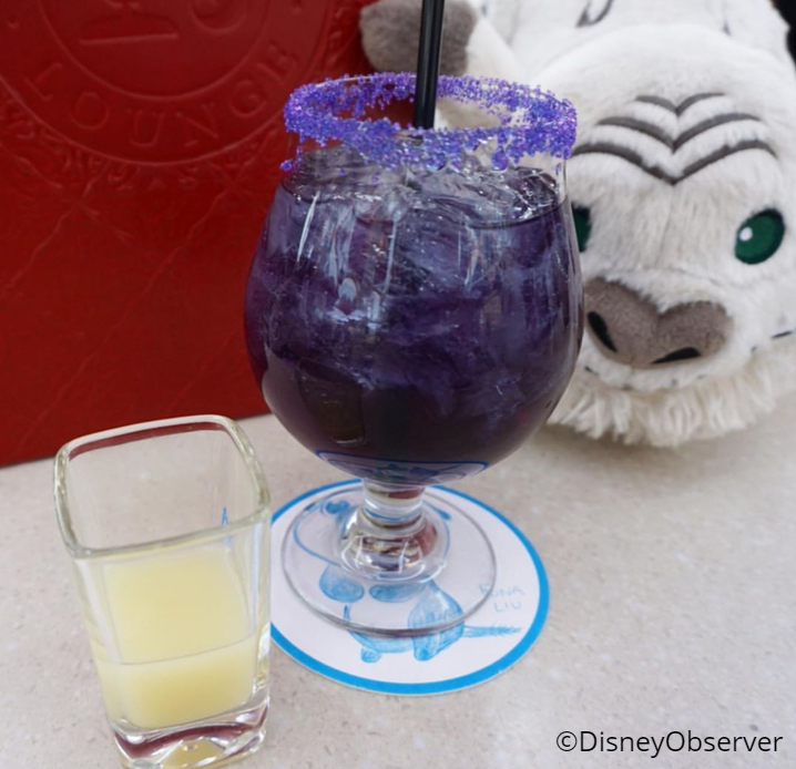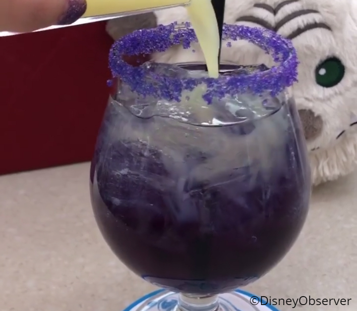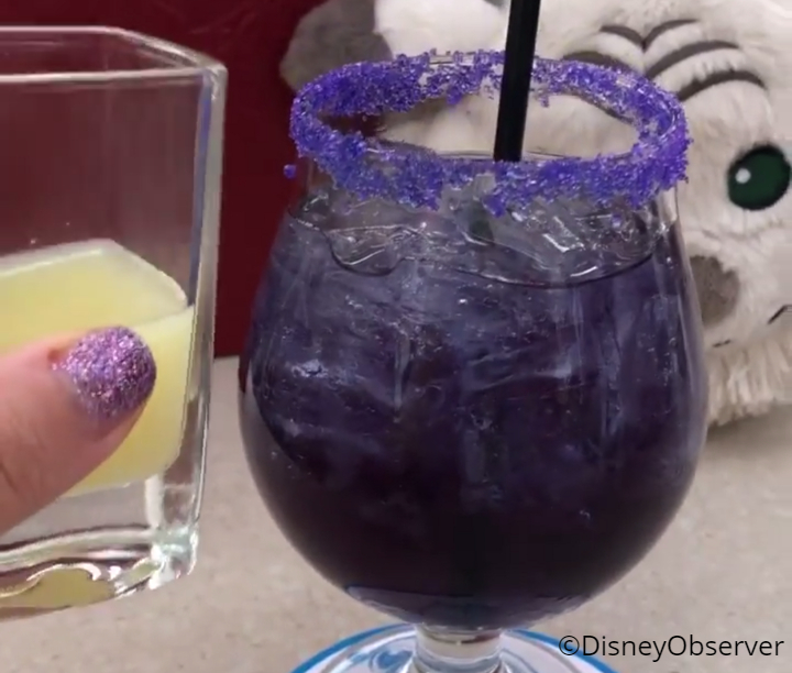 …into this lovely opaque purple beverage! How cool! (You’ll recall the color-changing noodles from last spring’s Pixar Fest perform similarly!) @DisneyObserver notes that this drink is pretty sweet — despite that sour lemon juice — making it easy to drink (dangrously so!).