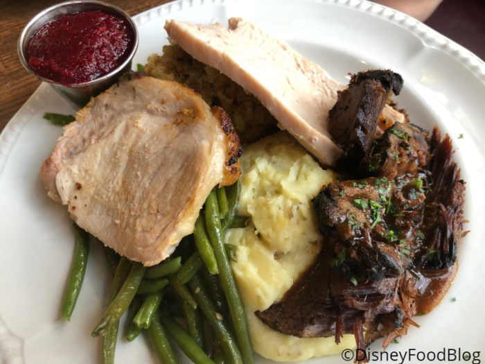 The Patriot’s Platter consists of Roasted Turkey, Oven-Roasted Pork, and Pot Roast. Sides include mashed potatoes, seasonal vegetables (green beans! yum!), stuffing, and mac and cheese.