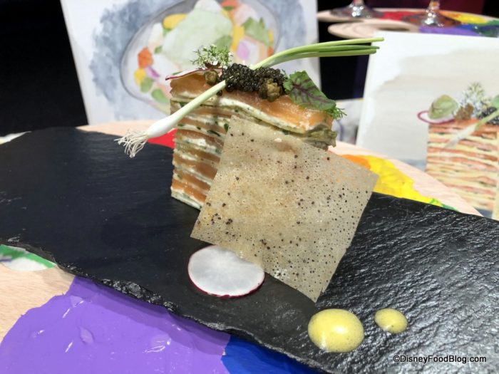 And the Smoked Salmon and Cream Gâteau with Egg Yolk Cream, Paddlefish Caviar, and Micro-herbs is a take on a classic Austrian layered cake in a savory form!