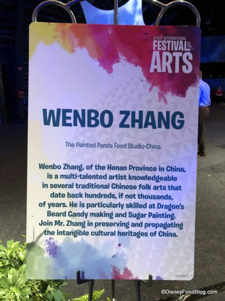 Okay, so the following candy you’ll soon see below, I want to stress, is NOT a traditional food booth item. But you simply have to stop by The Painted Panda Food Studio in the China Pavilion to see if you can catch Master Artist Wenbo Zhang who will be at The Painted Panda five days a week (check your Times Guide in the park for appearances).