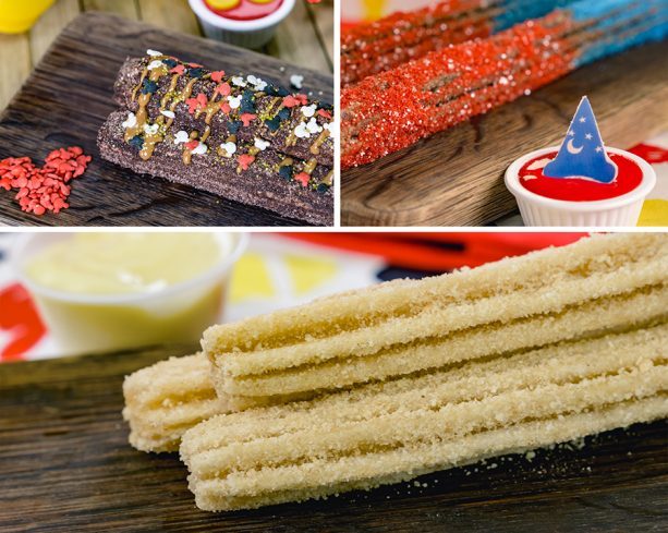 - Fantasia Mickey Churro – Warm chocolate churro dusted with red and blue sugar served with a side of red marshmallow crème and Sorcerer Mickey hat