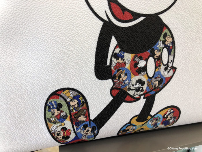 When you take a close look at the design on this tote you’ll notice Mickey isn’t in his red shorts and yellow shoes, but rather those are filled with pictures of him in his various roles throughout his 90 year career!