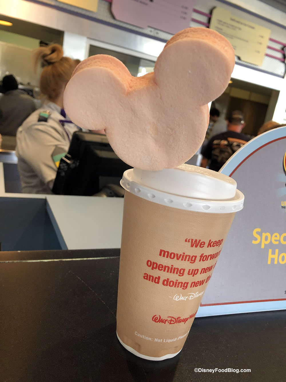 This is a traditional hot cocoa topped with a massive Mickey marshmallow! We first spotted this back in December for the holiday season, and it’s back!