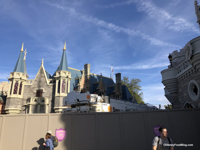 A crane is parked behind Cinderella Castle, and the holiday lights have started to come down. Until next year, sparkly castle lights!