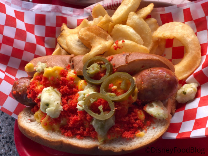 Check out all.that.cheese! This is great for cheese lovers, and the spicy salsa verde and (hidden Mickey!) jalapenos help to cut through the creaminess. But even with that contrast, it’s a heavy dog. You’ll want to consider sharing this one –especially if you’re pairing it with More Cheese Please!