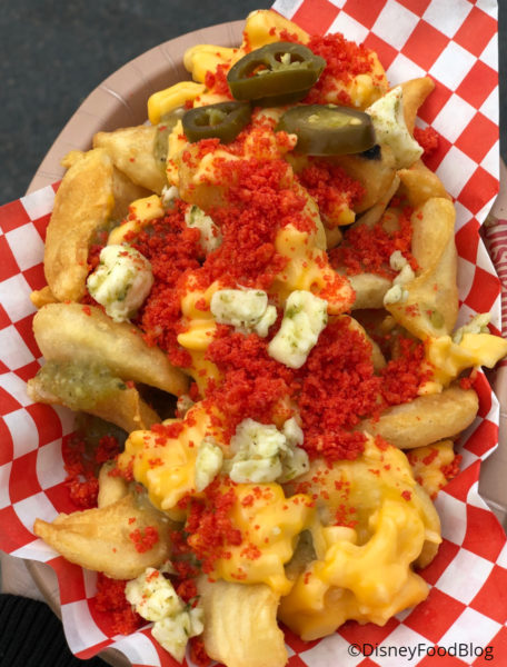 Yeah, we’re definitely into this! A Cheesy Celebration is a cheddar sausage link smothered in macaroni and cheese, salsa verde, crumbled cheese puffs, and cheese curds. Cheese on cheese on cheese on cheese!