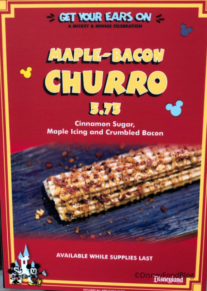 As with any Disneyland celebration, there are lots of specialty churros to try during Get Your Ears On. The Celebration Mickey Chocolate Churro wasn’t so great — so we’re happy the Maple Bacon surpassed its churro cousin!