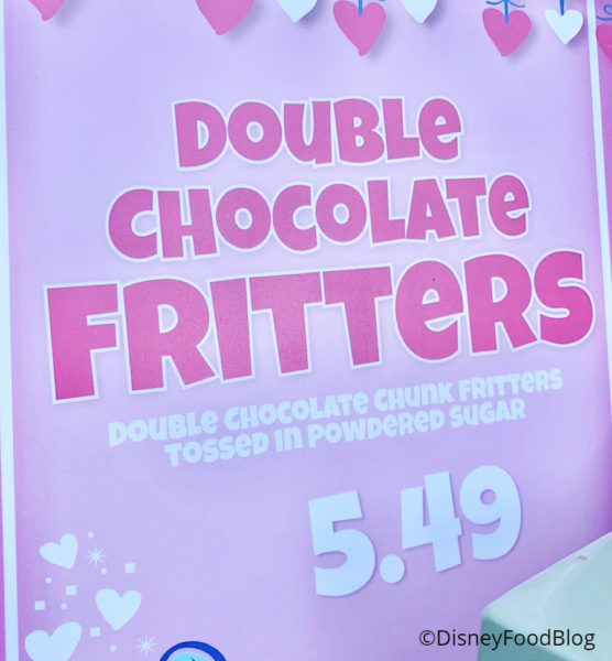 The Double Chocolate Fritters feature deep-fried chocolate batter spotted with chocolate chunks.