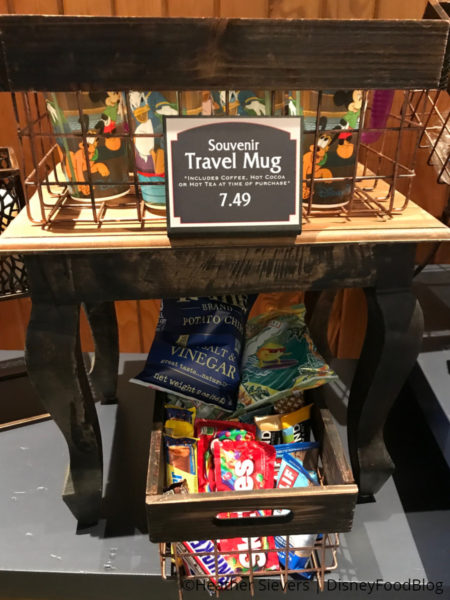 Candy and Chips are available, too. Plus you can grab a Souvenir Travel Mug to fill with coffee, tea, or hot cocoa a the time of purchase.