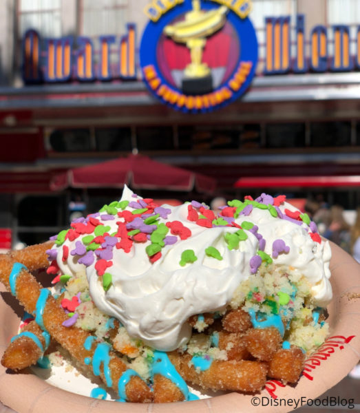 The Celebration Cake Funnel Fries are likewise very sweet, but these were a little less cloying for us. These crispy funnel cake fries are topped with crumbled funfetti cake! Yes: cake!