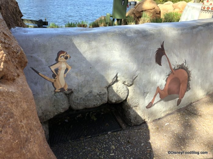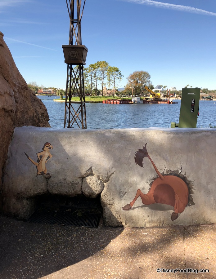 Timon and Pumbaa are keeping watch around World Showcase Lagoon.