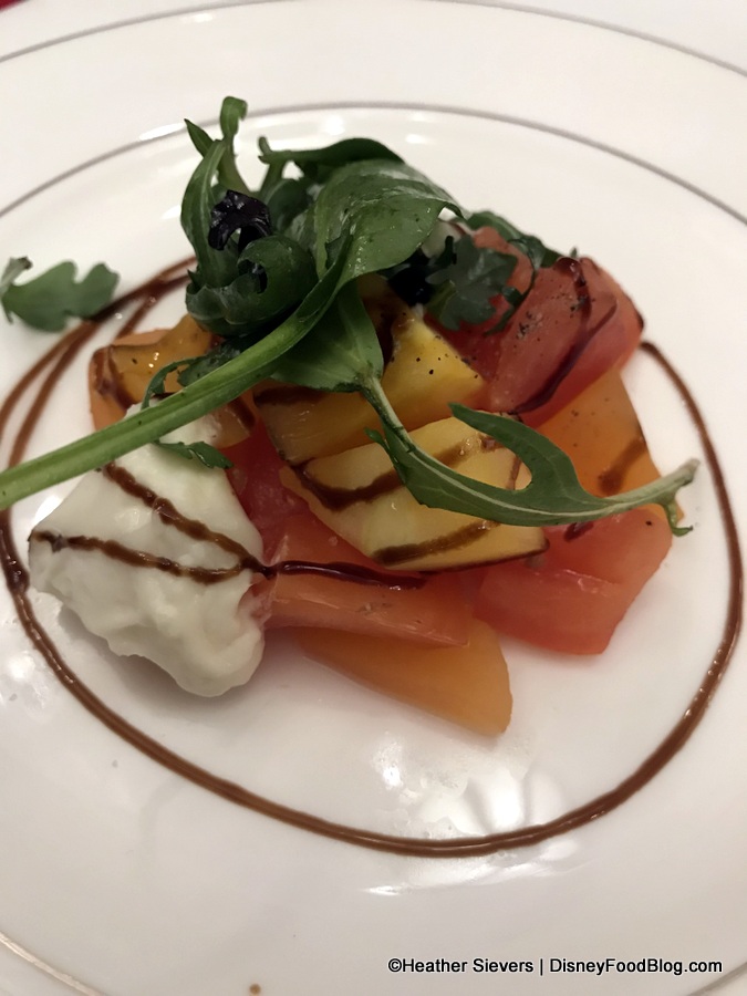 The Premium Party Salad is an earthy mix of tomato and burrata with olive oil and balsamic glaze, brightened in both color and flavor with melon.