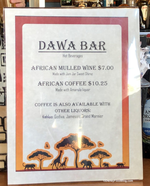 The Dawa Bar in Africa is helping you keep warm on “chilly” Florida days. You can choose from hot Mulled Wine or African Coffee here. African Coffee is also available at Tamu Tamu, but at Dawa Bar you can choose from a broader selection of liquors to make your coffee a spiked coffee.