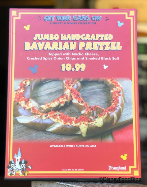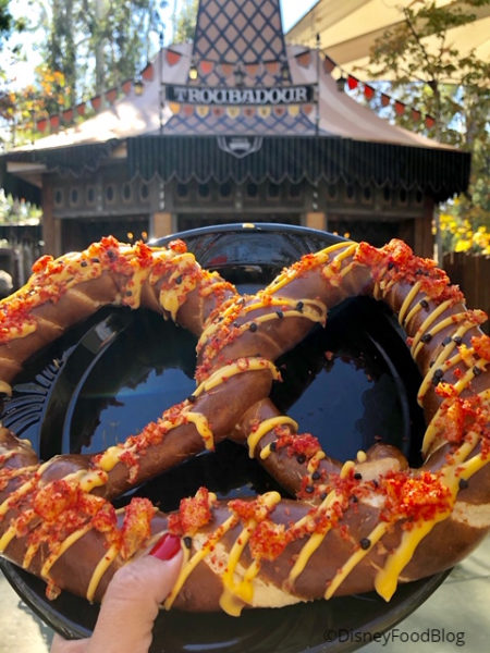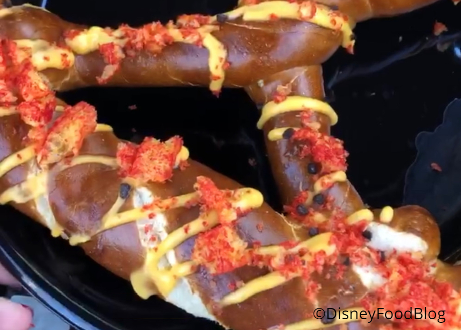 This pretzel feels the mouse-y love with toppings in Mickey’s signature colors: red, yellow, and black! And the toppings are pretty creative! The yellow is nacho cheese (yum!), the red is crushed spicy onion chips, and the black is smoked black salt.