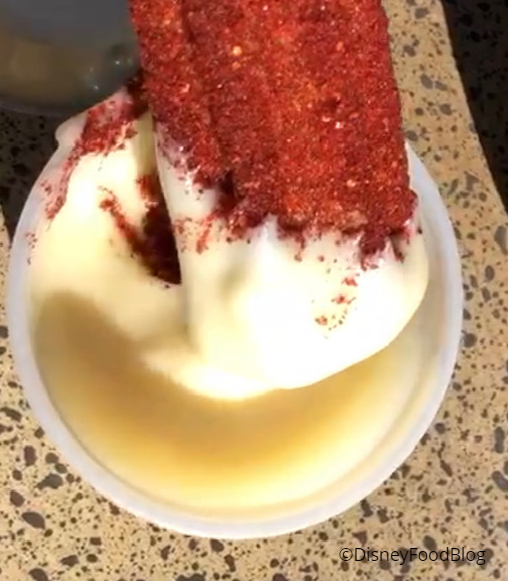 This is a Sweet and Spicy Red Sugar Churro with Double The Love Cream Cheese Frosting. To us, it tasted like the churro is coated in powdered Hot Tamales, so if you’re a fan of those, you’ll want to try this.