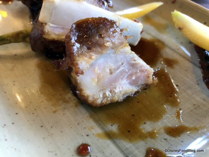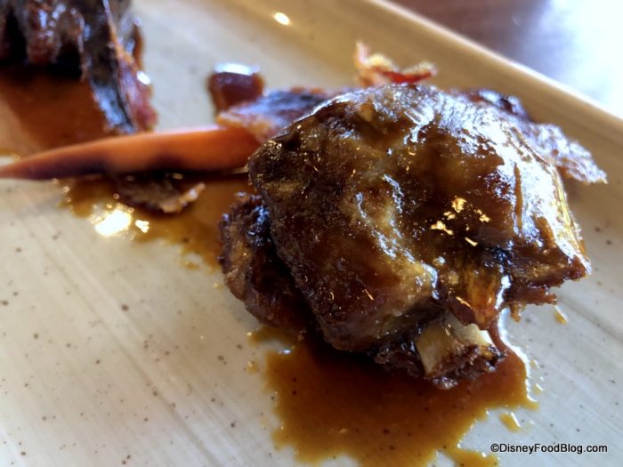 These are wrapped in honey bacon, and served with pickled rainbow carrots. From a flavor perspective, the dish comes together wonderfully.