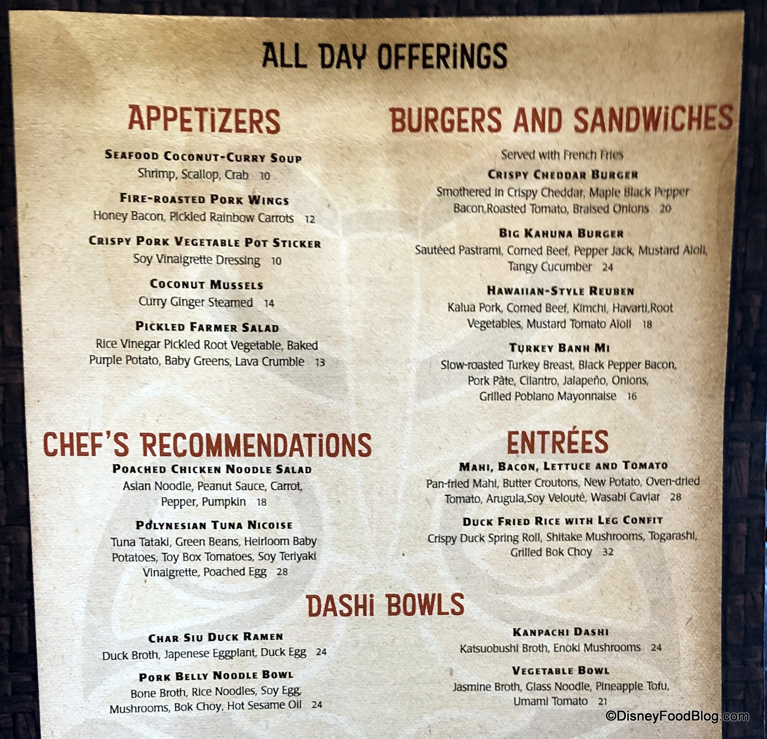 And we do want to stress again that the new items we had are all part of the All Day menu. Whether or not the semi-steakhouse from the Dinner menu will fly? Time will tell on that one, and we’ll be curious to see where today’s Kona Café goes from here!