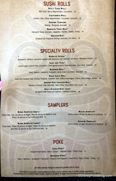 We stopped by Kona island on 1/23 to check it out. The cast member said we could order various items from Kona Cafe in the more casual setting — first come first served, no reservations. I decide to eat there a few days later I went (alone) sat down , no one else, but was told that the cast memeber who handles such requests was not there & I needed to go to Kona Cafe & see if I could get a reservation as they were bartenders. I left – no sushi.