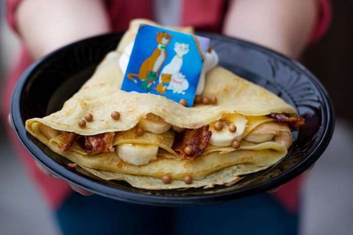 AristoCrepes in Disney Springs will be selling an off-the-menu item for a very limited time: a Peanut Butter and Banana with Bacon Crepe garnished with an AristoCats chocolate piece!