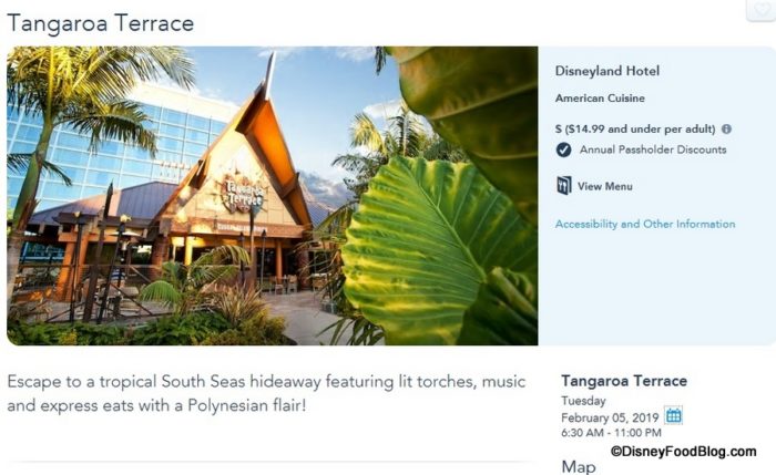Though an official reopening date has not yet been announced, we have noticed hours listed on the Tangaroa Terrace page on the Disneyland website coming up again for this coming Tuesday, February 5th, from 6:30 AM – 11:00 PM.