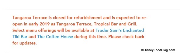 in Disneyland Hotel closed to begin a rather lengthy refurbishment in September 2018. Following the closure, Disney announced that the space would reopen in early 2019 as Tangaroa Terrace, Tropical Bar and Grill.
