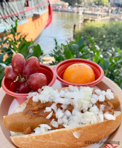 The Vegan Hot Diggity Dog is a vegan hot dog topped with a rather spicy lentil chili, onions, and mustard served on a hearty bun. This comes with sides of a clementine and grapes. We loved this hot dog! The spicy chili was satisfying, and the dog itself had great flavor!