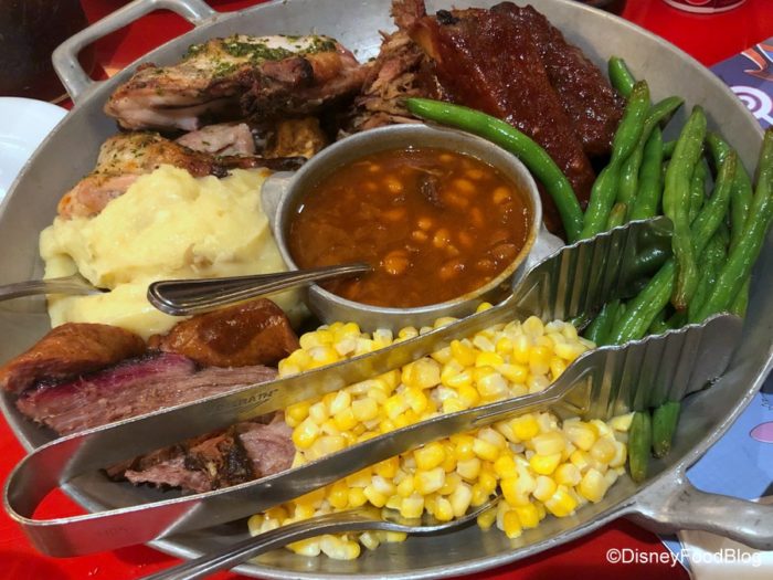 The skillet is, of course, the star. It consists of meat: herb-roasted chicken, barbecue pulled pork. smoked pork ribs, western-style sausage, and oak-smoked beef brisket. And there are plenty of sides: mashed Yukon potatoes, seasonal vegetables (ubiquitous green beans), buttered corn, and cowboy-style baked beans.