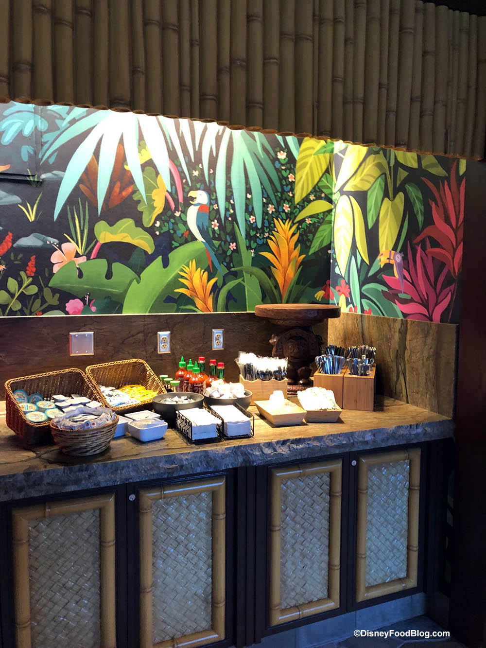 Now, on to more of the newly refurbished location! When Tangaroa Terrace closed for refurbishment we were promised light fixtures made of colorful fishing floats and netting, a tropical mural, and bamboo accents. We’d say there’s a new tropical mural!