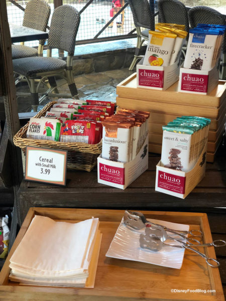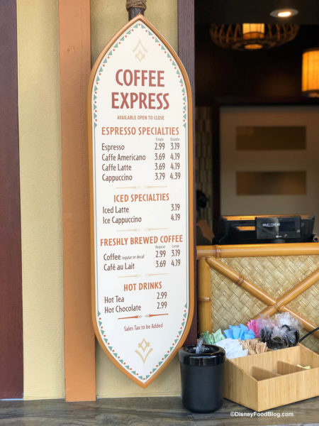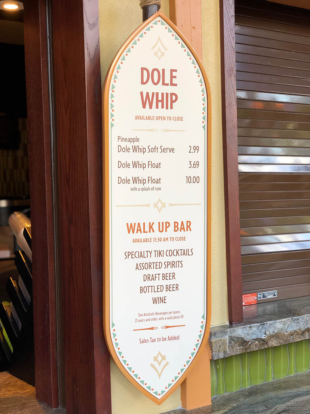 …or who needs coffee when you can have DOLE WHIP! You can have your Dole Whip as a traditional soft serve, or as a Dole Whip Float (with or without rum). If you prefer other indulgences, there are some Specialty Cocktails, Assorted Spirits, Draft and Bottled Beers, or Wine here as well. Note that our receipt here was from Trader Sam’s, so the walk-up window Tiki cocktails, etc are probably the same as what you’ll find at Trader Sam’s next door.
