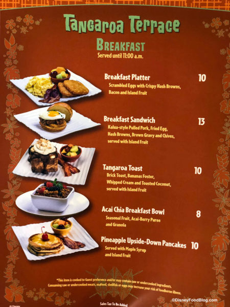 Just like the lunch and dinner menu, the breakfast menu has a few changes as well. You’ll still find the Breakfast Platter here. Additions are the Breakfast Sandwich (which replaces the Breakfast Wrap) Tangaroa Brick Toast (looks a lot like Tonga Toast to us!), Acai Chia Breakfast Bowl, and the Pineapple Upside-Down Pancakes.