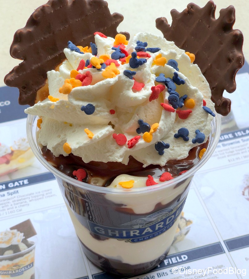 Most notable about this sundae is, of course, the use of chocolate-dipped waffle cone pieces used to evoke Mickey’s iconic ears. And because this is Ghirardelli, these ears are delicious. Crunchy, subtly sweet, and coated in that terrific Ghirardelli chocolate.