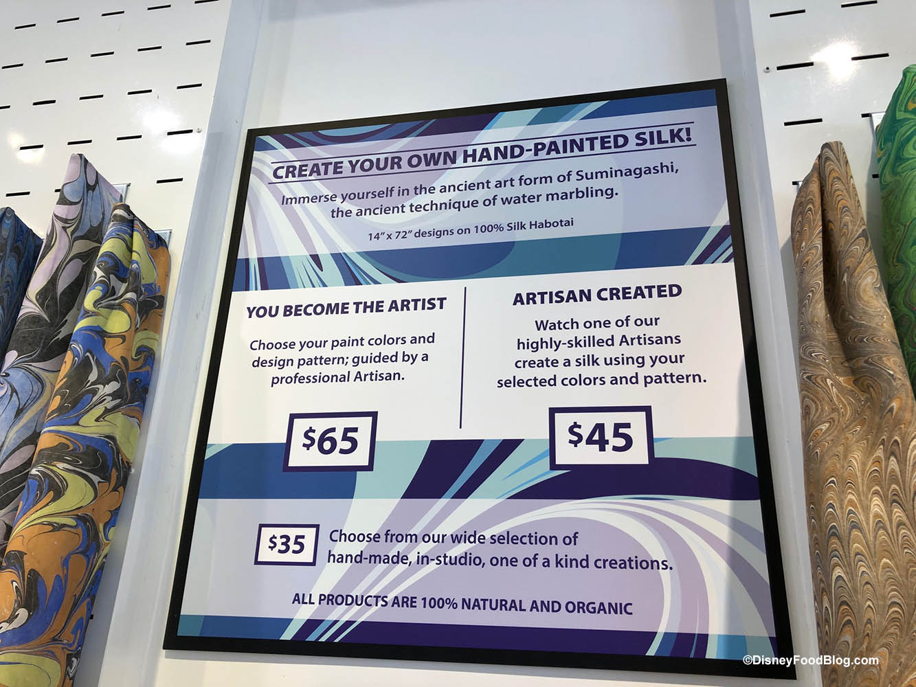 If you’ve been to the Epcot Festival of the Arts you may have seen this fun way to decorate fabric there. There’s an area of the Art Corner dedicated to Artistic Marbling.