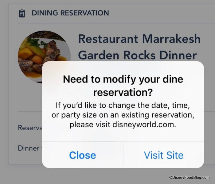 If you have an Advance Dining Reservation for a Disney World restaurant, you may notice a pop-up message when you open your My Disney Experience app and try to modify that reservation.