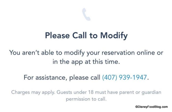 Some users are receiving a notification that they are unable to modify dining reservations in regards to changing the date, time, or party size via the app. (It seems that Apple device users primarily are unable to modify; Android users may not experience any changes to their options.) Guests are advised to visit disneyworld.com to modify or call (407) 939-1947 for assistance.