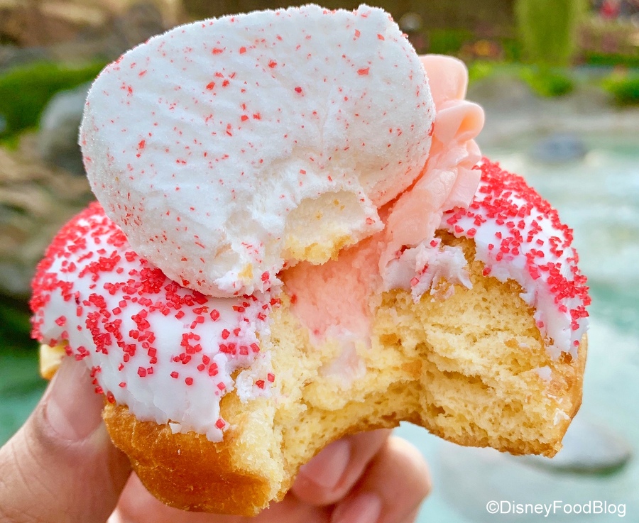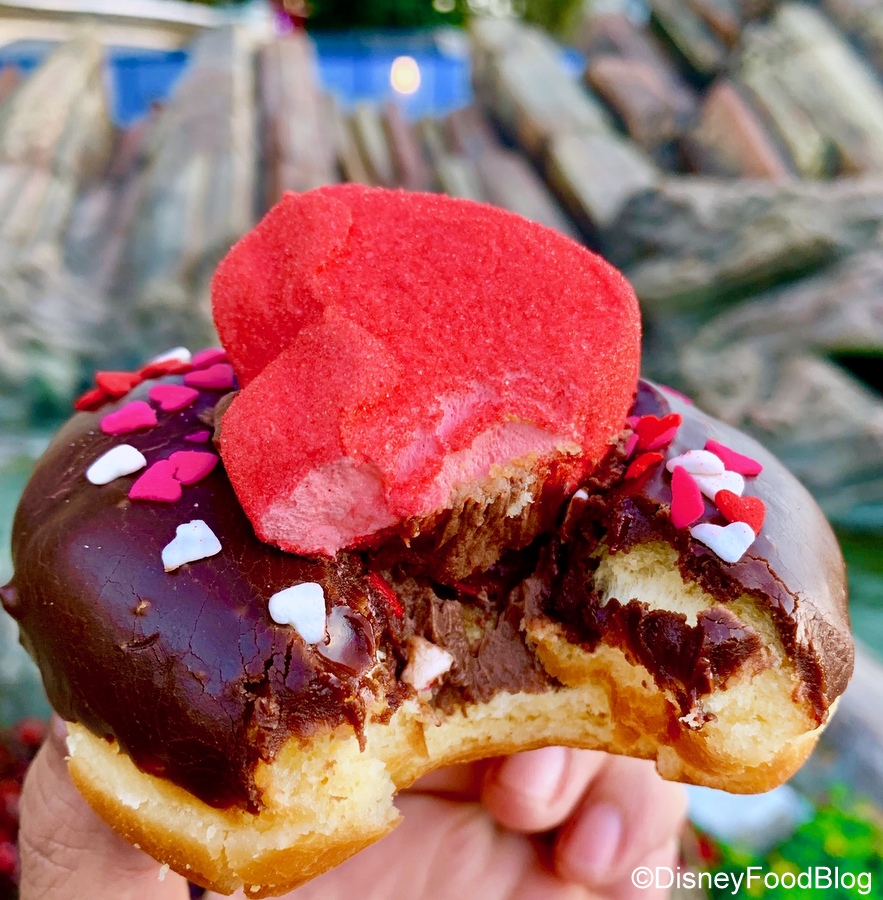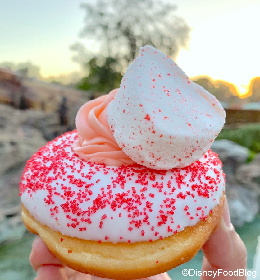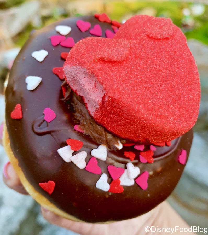 The Mickey Valentine Surprise Donut has a chocolate glaze and cute heart-shaped sprinkles. It’s topped with another sugar-coated marshmallow, this time red sugar on a pink marshmallow.