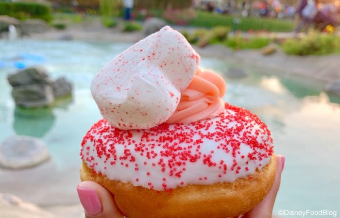 Valentine’s Day is just around the corner, and you just knew the Donut Cart near Sleeping Beauty Castle in Disneyland Park was going to get in on the action. They’ve created two stylish donuts that are as delicious (and sweet!) as they are pretty. The Valentine Donut starts out simple enough with a basic yeast donut. But then… things get pink real fast.