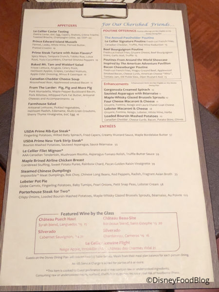 We recently let you in on a secret menu poutine that applies to Annual Passholders (but can be had by anyone!). Annual Passholders who make their Advance Dining Reservation via My Disney Experience will receive a menu with the added Annual Passholder Poutine — Le Cellier’s Signature Poutine. It will not appear on the regular menu received by non-Annual Passholders, but anyone can request this, Passholder or not. So don’t be shy if you want to try it! These French Fries topped with Red Wine Reduction, white truffle, and Canadian Cheddar are totally worth a try! Even if it’s not on your menu — go ahead and request it.