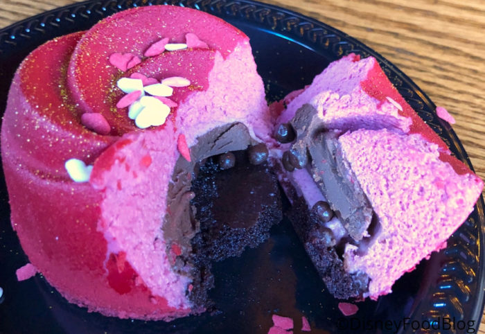 Cherry Mousse is just in time for Valentine’s Day and its celebratory umbrella event Get Your Ears On. This dessert consists of a center of dark chocolate ganache on a base of chocolate crunch. The rose-shaped cherry mousse is coated in red velvet spray (!) and sprinkled with gold dust and mini heart sprinkles. And it is totally ready for its close-up!