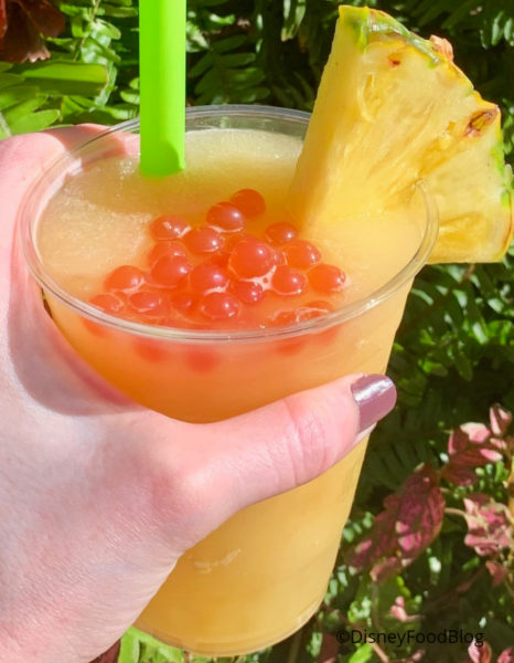 Piranha Lemonade Slushy is a mango and pineapple slushy with lychee and pomegranate popping pearls! It’s as refreshing to drink as it sounds!
