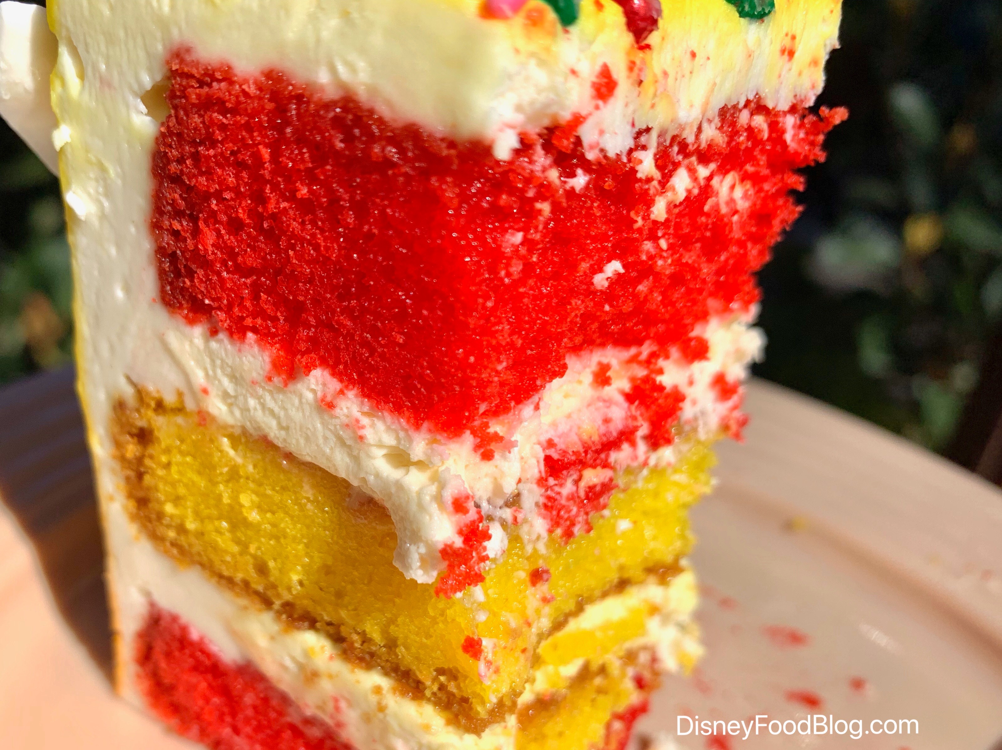 We found the cake itself to be dense and moist with your typical vanilla cake flavor. The filling between each layer of the red and yellow cake was awesome! Despite being described as having a “raspberry and lemon filling,” I would have been convinced if someone described it as a lemon ONLY filling. Perhaps there was a small hint of raspberry, but only slightly. The filling was THICK and flavorful. The moisture of the cake and the thick filling together made for a great quality slice of cake!