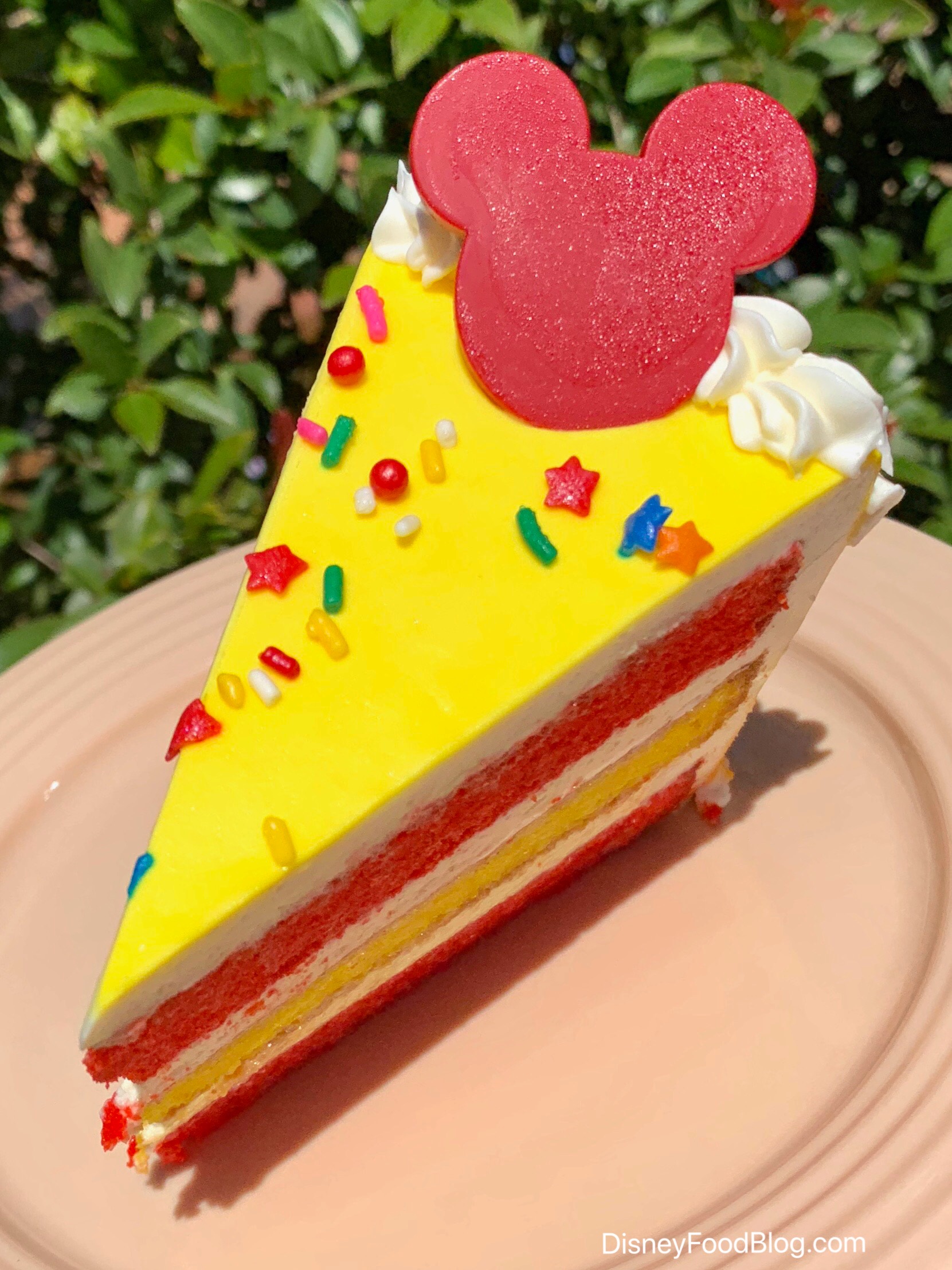 Disneyland has seriously been killin’ it with all those amazing Get Your Ears On Celebration treats! We’ve already reviewed the awesome Fried Chicken and Beignets at Orleans Cafe in Disneyland and the yummy Mickey’s Chocolate Cup and Brownie at Fiddler, Fife, & Practical Cafe in Disney California Adventure Park – you can check out all the limited edition eats here. But today we got to try the FINAL snack to be released in the Get Your Ears On Celebration and we got the FIRST SLICE EVER — I present to you…the Celebration Cake!