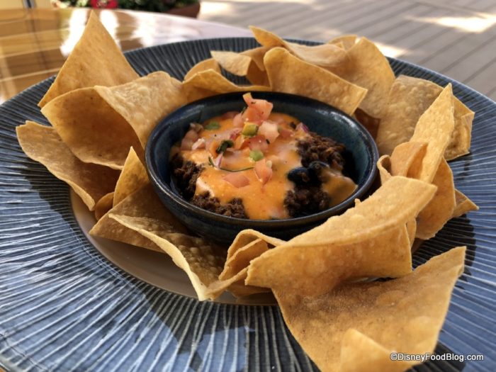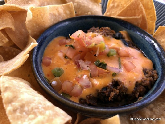 The Chili Con Queso takes skirt steak chili and combines it with pimento cheese and pico de gallo served with fried tortillas.