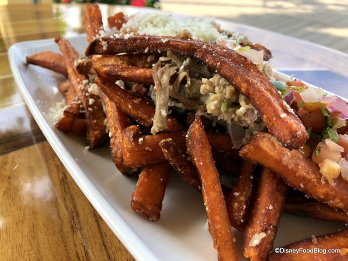 The Loaded Sweet Potato Fries are topped with your choice of Pulled Pork, Beef Brisket, or Jerk Chicken.