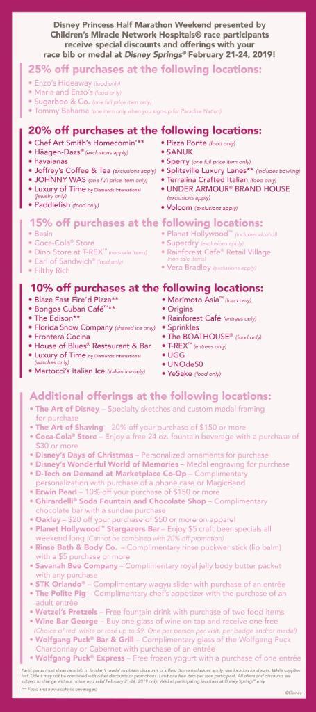 Discounts are available from February 21-24, 2019 for participants who show their race bib (or medal, once you receive it) at participating locations which include merchandise and dining spots. Dining options include food at table service locations such as Chef Art Smith’s Homecomin’ and Splitsville Luxury Lanes. (Note that some discounts are applicable to food only.)
