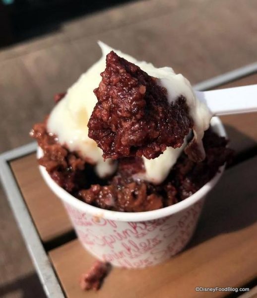 You’ll notice it’s served in an ice cream bowl, but that’s just because it’s the best way to serve this treat. Served warm, this cake bowl is topped with more-than-a-dollop of super sweet cream cheese frosting. That cake is infused with both cocoa and a bit of brandy and it all comes together in an ooey, gooey, completely delicious way! It’s basically like a red velvet lava cake PLUS FROSTING.